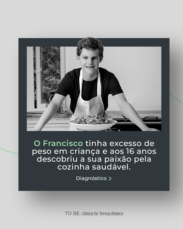 Em criança, o Francisco lutava com o excesso de peso. Aos 16 anos, encontrou na cozinha saudável o início da sua mudança. Na TO BE., ajudámos a transformar a sua vida — um exemplo de como abordagens personalizadas, análises regulares e hábitos saudáveis fazem toda a diferença. Veja o testemunho completo e descubra como a TO BE. pode fazer o mesmo por si.